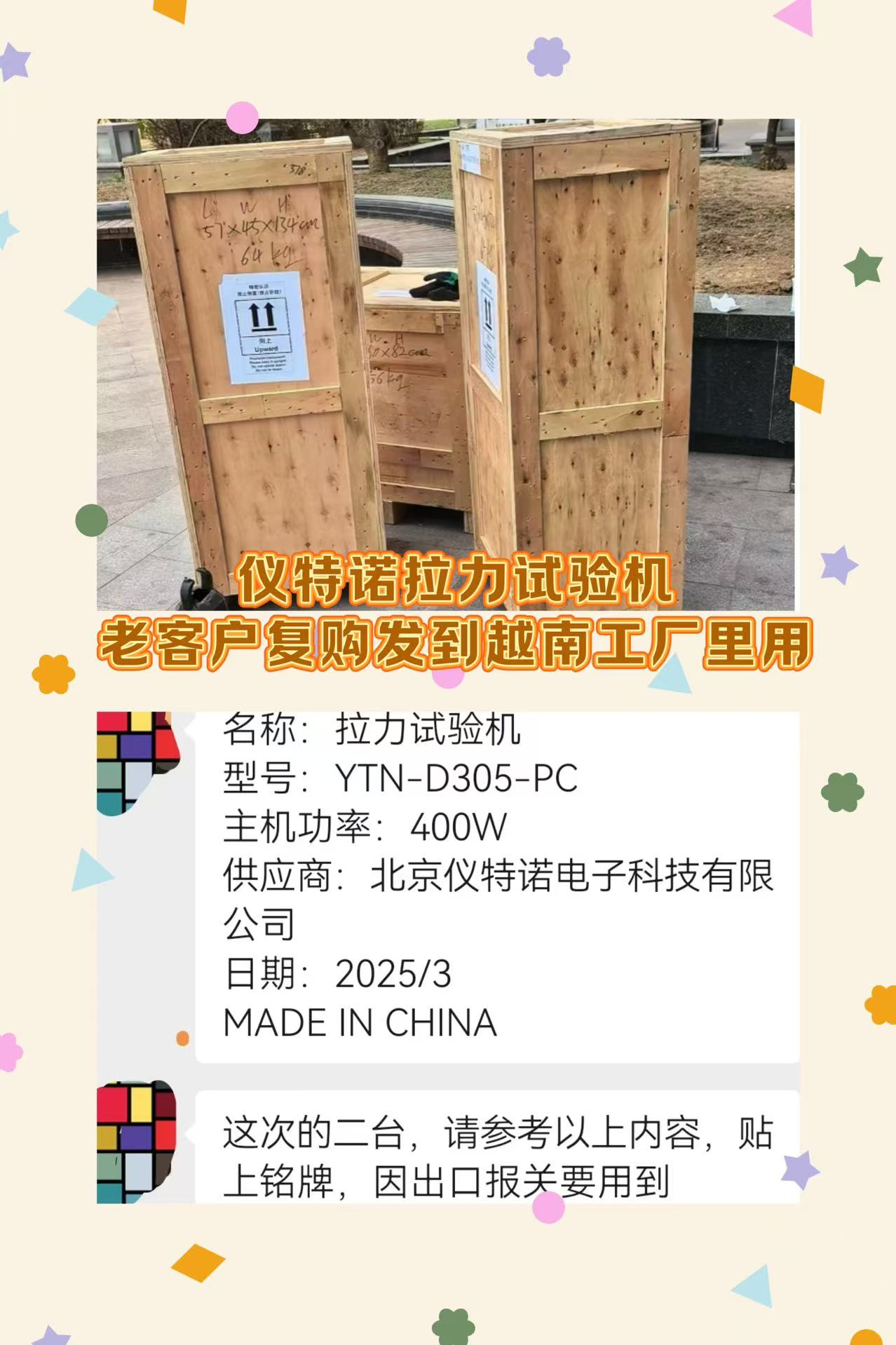 老朋友就是给力!再次复购2台单柱拉力试验机,发往越南工厂。感谢信任,我们一定用靠谱的机器和贴心的服务,让您用得更放心!