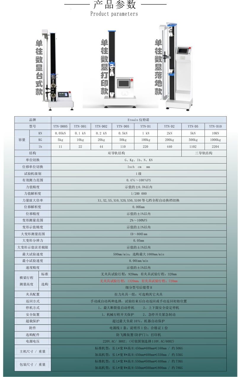 YTN-D系列单柱万能材料试验机/拉力试验机凭借其高精度、多功能、操作简便和安全可靠的特点,成为材料力学性能测试的理想选择。无论是科研实验、质量控制,还是产品研发,YTN-D系列都能为您提供精准的测试数据和可靠的性能保障。选择YTN-D系列,选择品质与信赖,助力您的产品在激烈的市场竞争中脱颖而出。